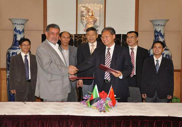徐飛洪大使(右三)與阿方能源水利部水務(wù)司長(zhǎng)穆罕穆迪(左二)互換移交證書(shū)