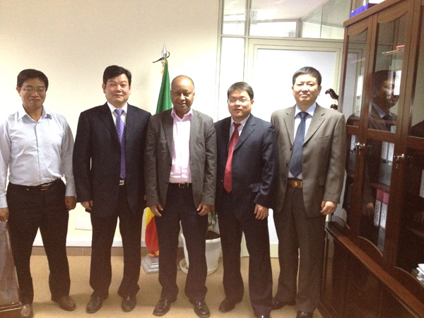 董事長王元旦(左二)、副總經(jīng)理張周平(右一)、聶玉和(左一)、埃塞分公司經(jīng)理王毓平(右二)與埃塞政府前副總理(現(xiàn)任埃塞糖業(yè)公司總經(jīng)理)ABAY TSEHAY(左三)合影