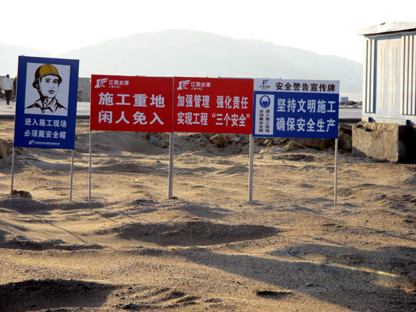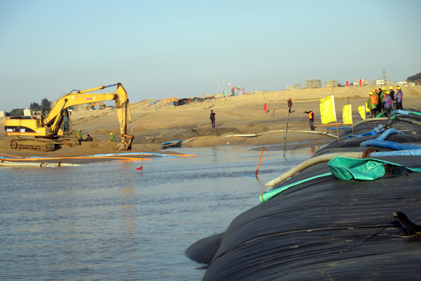 平潭綜合實(shí)驗(yàn)區(qū),主島為海壇島,位于福建省東部,與臺(tái)灣隔海相望,是中國(guó)大陸距離臺(tái)灣島最近的地方,是中國(guó)第五大島,有福建的“馬爾代夫”之稱。平潭綜合實(shí)驗(yàn)區(qū)如意湖防潮閘工程項(xiàng)目總投資1.3億元,我公司承建的土建工程包括排澇閘、防潮閘、公路橋、上下游兩岸翼墻、防沖消能、控制房等土建工程施工(含導(dǎo)流明渠開挖、圍堰填筑)。平潭(簡(jiǎn)稱嵐)年平均風(fēng)速超過五級(jí)以上,大風(fēng)呼嘯,沒來(lái)這里感受不到風(fēng)有多大!依據(jù)工程設(shè)計(jì)及進(jìn)度要求,在落差8m潮汐中的軟基上進(jìn)行圍堰模袋充砂以截流海水,在惡劣地質(zhì)條件的海中建閘,與潮水賽跑、跟臺(tái)風(fēng)搶工期,潮起潮落,給工程建設(shè)平添了許多艱難與艱辛。