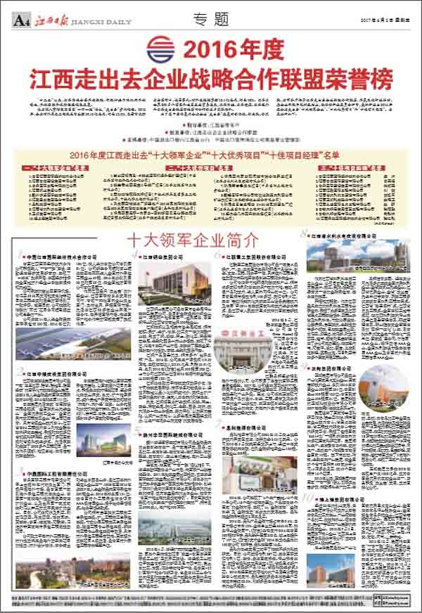 6月3日,江西走出去企業(yè)戰(zhàn)略合作聯(lián)盟2017年大會(huì)在南昌召開。省委常委、常務(wù)副省長(zhǎng)毛偉明出席大會(huì)并作重要講話,會(huì)上省委常委、常務(wù)副省長(zhǎng)毛偉明、省政府秘書長(zhǎng)王亞聯(lián)和省商務(wù)廳廳長(zhǎng)王水平分別為2016年度全省走出去“十大領(lǐng)軍企業(yè)”、“十大優(yōu)秀項(xiàng)目”和“十佳項(xiàng)目經(jīng)理”授牌。江西走出去企業(yè)戰(zhàn)略合作聯(lián)盟輪值主席、中國(guó)江西國(guó)際經(jīng)濟(jì)技術(shù)合作公司總經(jīng)理徐國(guó)建報(bào)告了2016年工作,國(guó)家開發(fā)銀行江西分行、中國(guó)進(jìn)出口銀行江西省分行和中國(guó)出口信用保險(xiǎn)公司南昌營(yíng)管部作為聯(lián)盟副主席單位發(fā)言。公司董事長(zhǎng)王元旦作為十大優(yōu)秀項(xiàng)目的企業(yè)代表發(fā)言。《江西日?qǐng)?bào)》、《江西衛(wèi)視》相繼對(duì)大會(huì)進(jìn)行了大幅報(bào)道。