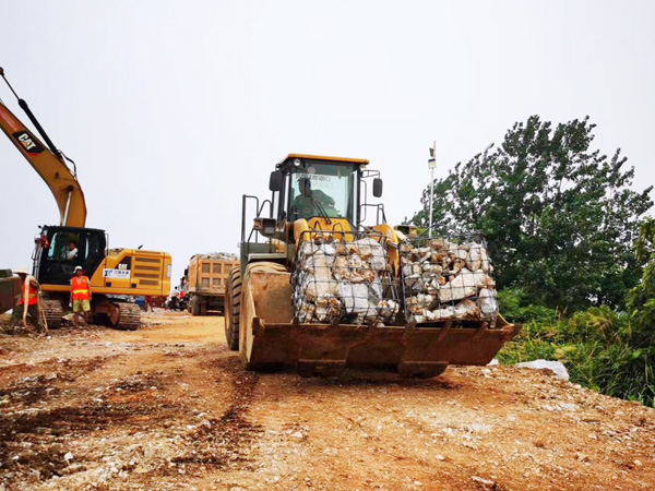7月14日14時,封堵作業(yè)正式啟動,南北兩岸同時進占施工。然而,困難層出不窮:道路不平,存在積水,影響車輛通行;一線搶險人員的生活保障還不夠完善,吃住條件艱苦,防雨防曬防蚊設施簡陋,無便攜照明設施;砂石骨料耗量巨大,但存在配額限制,獲取來源較少。但現(xiàn)場人員攻堅克難,積極與政府、當?shù)丶捌h廠商溝通,解決了人員基本需求和石料問題,并在當日順利鋪石20米,邁上堅實的第一步。