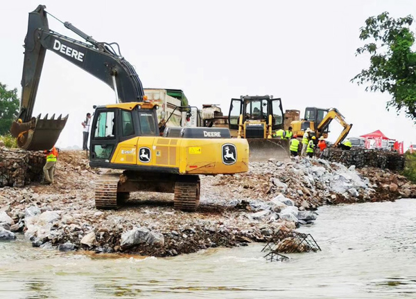 整個封堵工作共動用水建公司400余名施工人員;調配挖機12臺、裝載機5臺、推土機2臺、運輸車216臺;調配塊石約3萬立方米、卵石約2500立方米、粘土約9000立方米、1立方米鋼筋籠260多個、3噸重混凝土塊160多塊。