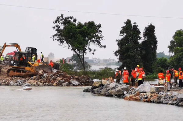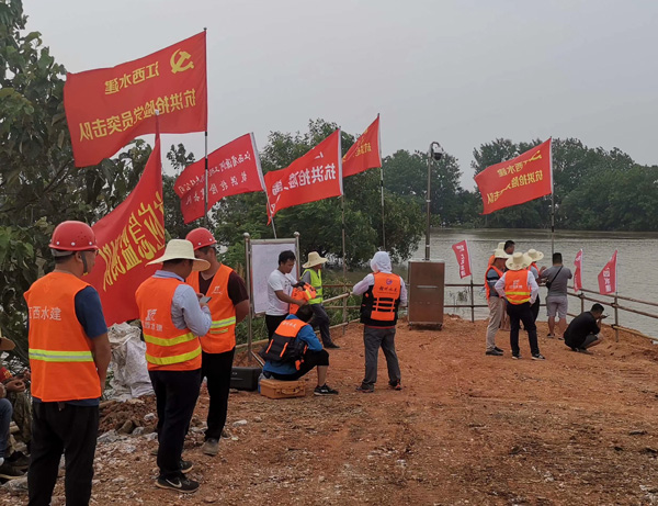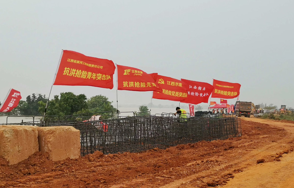 7月12日晚,九江市永修縣三角聯(lián)圩發(fā)生潰堤,決口長度100多米,洪水淹沒了圩堤內(nèi)紅旗村、永豐墾殖場等部分地區(qū)。公司在接到省防指和水利廳下達的防汛任務后,積極響應,緊急抽調并組建了一支90余人的專業(yè)隊伍,并迅速落實機械設備。由公司黨委書記、董事長王元旦親自帶隊,星夜馳援一線。