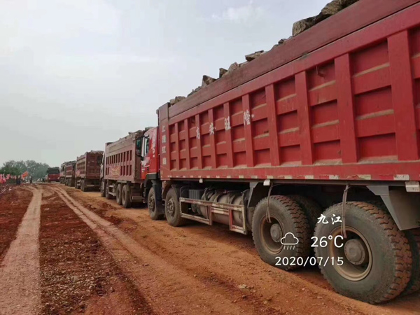 7月15日凌晨,貨車連夜運送石料入場,現(xiàn)場材料調度人員徹夜不休,僅借助貨車大燈照明,順利完成調度工作。當日,決口成功封堵70米。